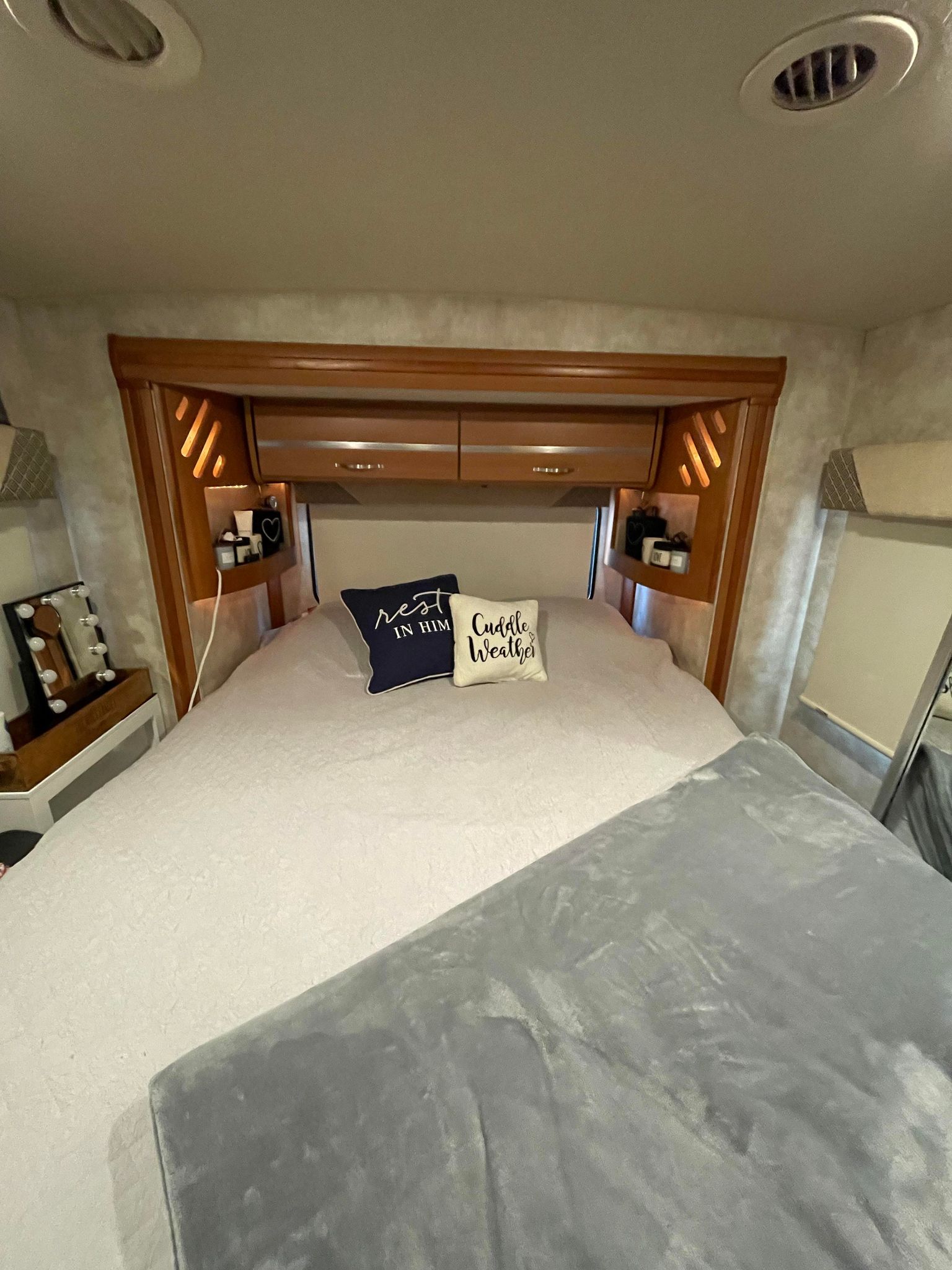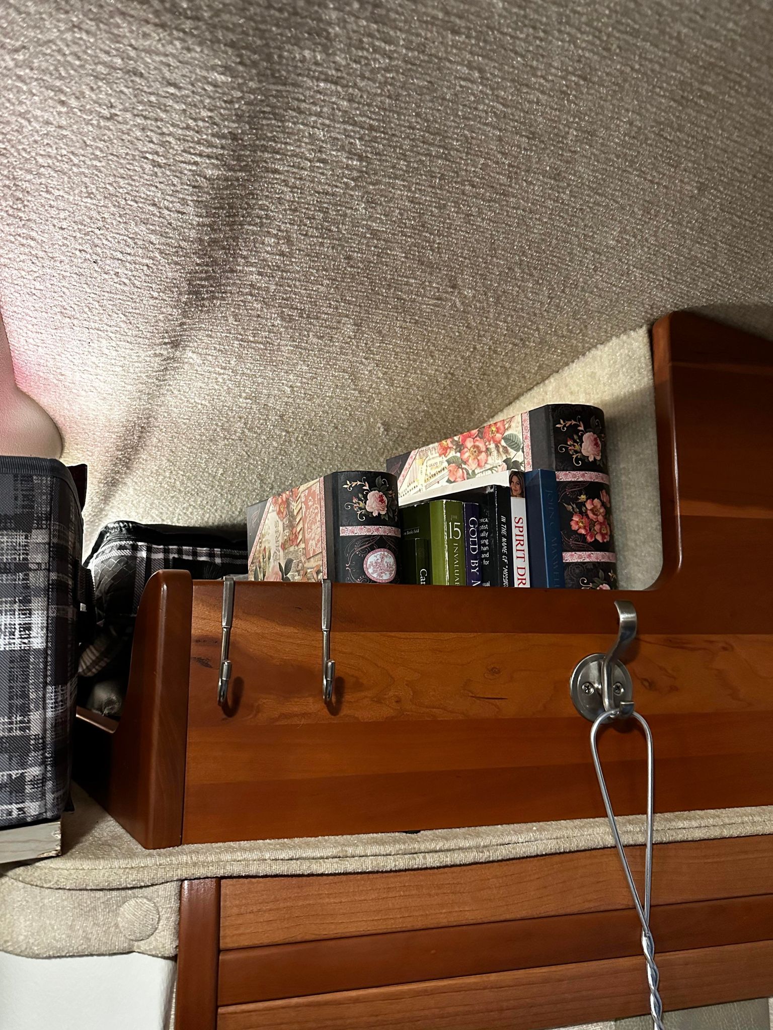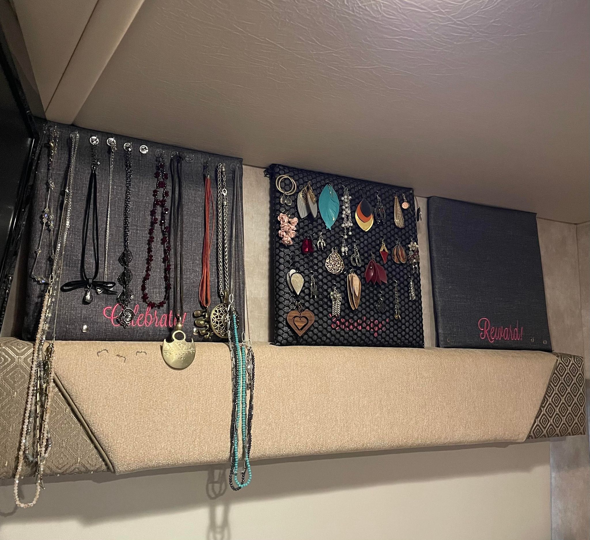 Those decorative squares above the window in the bedroom were 12″ bulletin boards I had from 31. I was delighted to see that they could be shoved in that space and hold all my jewelry and headbands perfectly while also serving as decor back there. I love repurposing things and finding spaces where they fit just right! The tiny, white nightstand with my little mirror on top was repurposed from our bathroom at home. It’s just narrow enough to add some storage and create a vanity space for me without blocking the slide going in and out for the bed.
