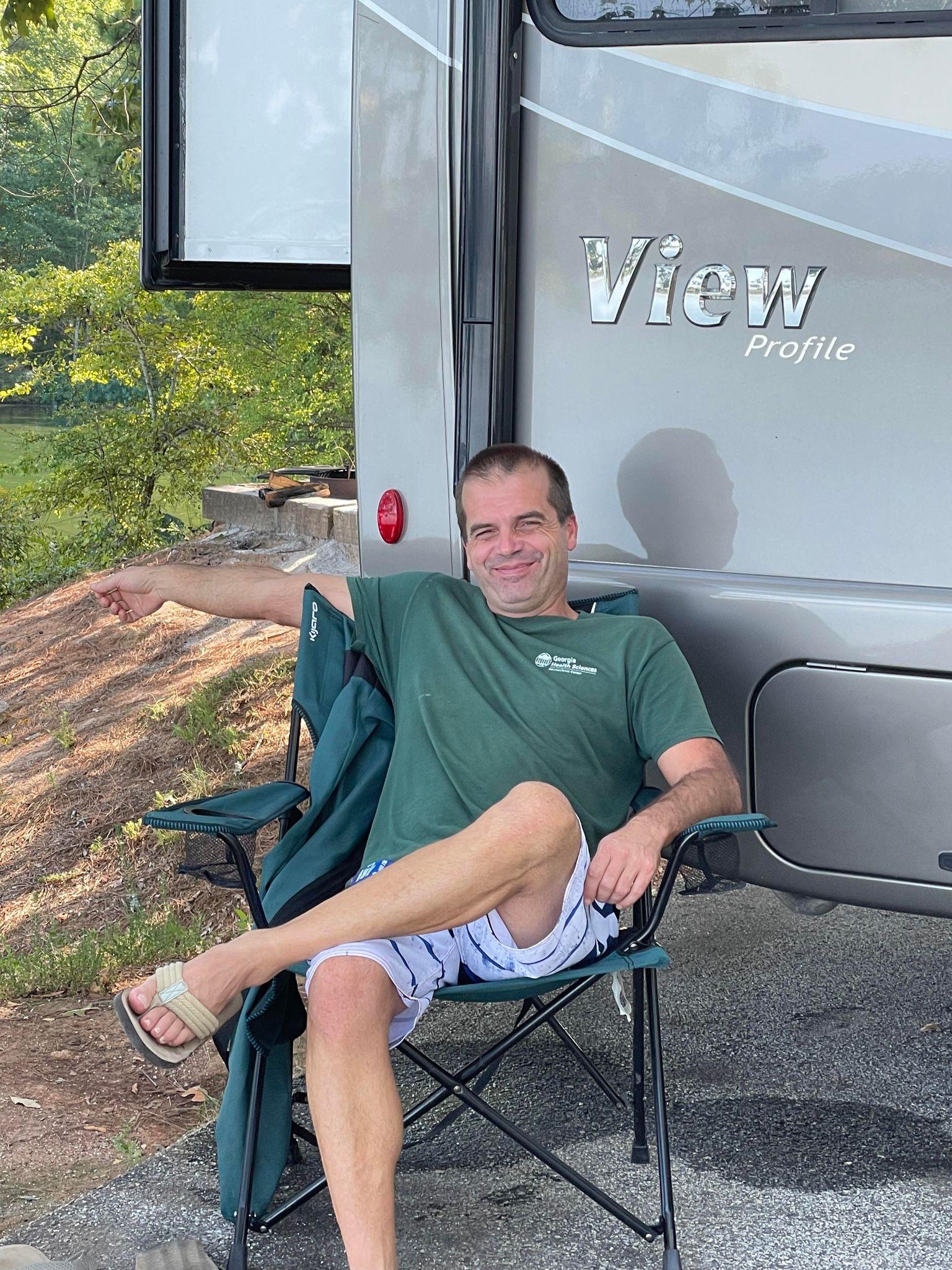 We took the RV out for her ‘maiden voyage’ at a local lake this week! We stayed somewhat close to home so we could still go back to work on a few projects and grab anything that we’d forgotten to pack. Except for a swarm of some sort of insects that sounded (and looked) a lot like mosquitoes our first night, the ‘dry run’ went relatively smoothly. We discovered an open space (created by the slide opening) under the bed that we need to fill. Until we get that fixed, we’ve just been more careful with our lights after a certain time at night. This has given us a fairly early bedtime – something almost unheard of for two night owls! But we’re not complaining for sure! We added a 4″ memory foam topper to the rather thin RV mattress before this trip, so the bed is pretty cozy now. Going to bed early and having pretty sights to enjoy with my morning coffee has been a refreshing treat!