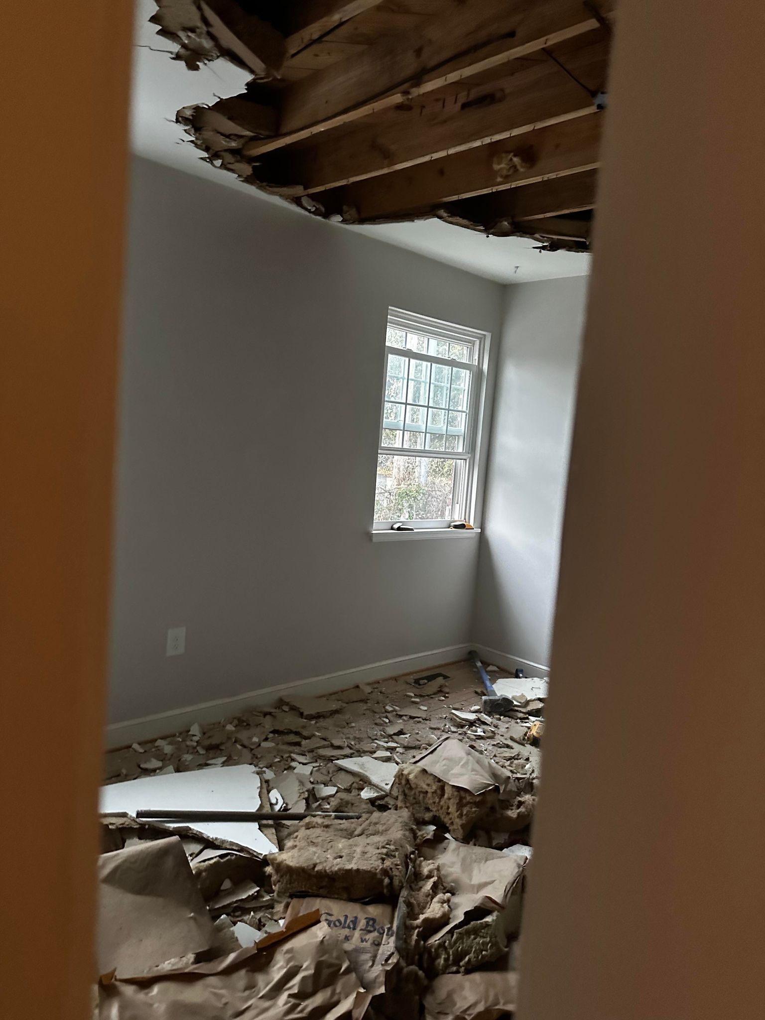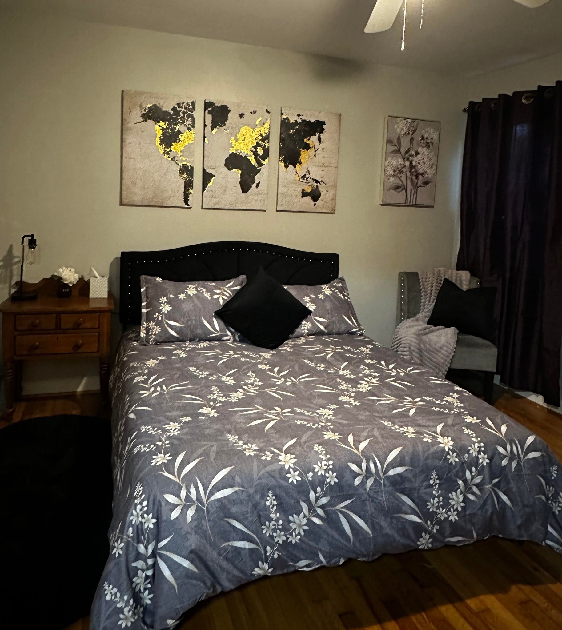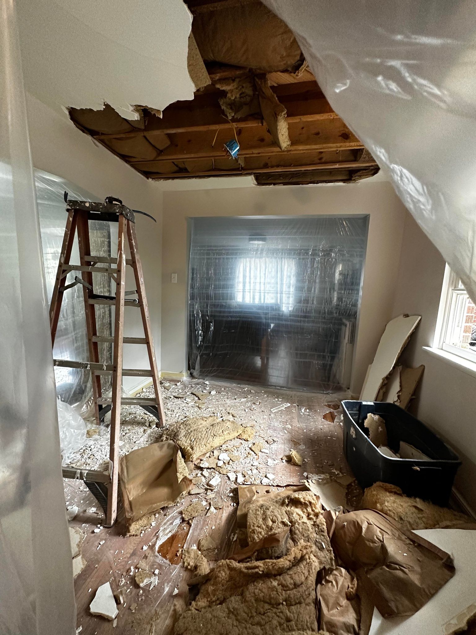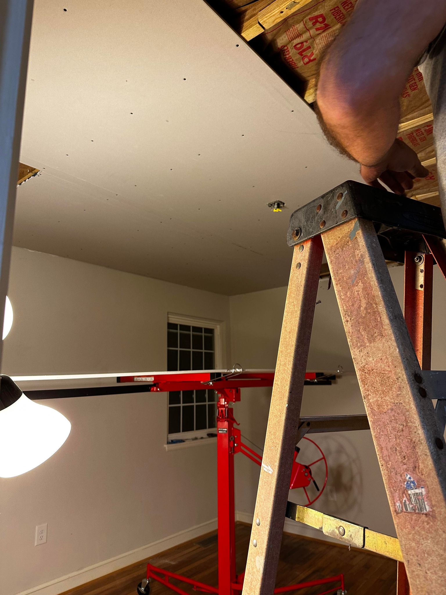 It’s hard to believe that it’s been nearly 3 months since my last post, but I promise you – we haven’t been slacking! 😉 Turning this duplex into student housing (upstairs) and an AirBnB (downstairs) was meant to be a fairly straight forward process. We thought we’d touch up some paint, move in our furniture, add some cute decor and be ready to list it. But, as is often the case with real estate – the more we did, the more the projects grew! I’m sharing a little bit of our process replacing the first, collapsing ceiling in the pictures below. In my last post, you saw it mid tear down. Since Daryl and I were trying to replace an entire ceiling by ourselves, we purchased a dry wall lift to help us get those huge pieces of drywall up into the air. This project stretched on for a few weeks with Daryl working more than full time in between mudding, drying time, sanding and more mudding. There was no end to the dust and the piles of tools! Finally, we thought we were finished. We repainted, furnished the room and hung burgundy curtains – hoping that the end of all the construction projects was just around the corner.