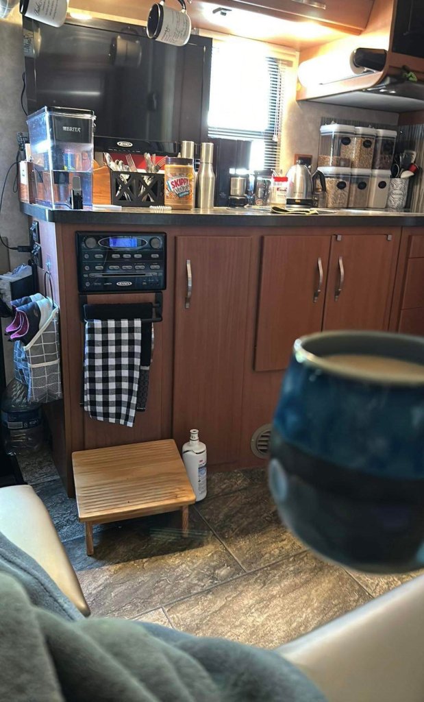 We have many adjustments ahead and difficulties are a normal part of any life – even one in an RV. But there are also so many joys to be found in the every day details and opportunities that make up our lives! You may see a water filter on the floor in the RV coffee picture – that’s because it shattered in our last deep freeze and has to be replaced. Until we get it replaced, we can’t hook up to the water supply since there’s no cut off valve under the sink. If we did, water would flow out everywhere. I went to multiple stores today and nobody carries them or has them in stock. So, we’re starting our adventure without water inside. There’s spigot outside, but it’s a bit hard for flushing the toilet or doing dishes, etc. The new filter had to be ordered and won’t come in until Tuesday – so that’s a week without water. There are no bathrooms or showers at this RV park either, but thankfully, there’s a gym just 4 miles down the road. I have a membership that will get me into any of their 2,400 locations around the US and this is where we’ll shower anytime we’re staying at a park without showers. I had my own adventure in the shower there today – I’m a hot bath girl through and through! Shaving, in a strange shower, in a public gym, with only a thin shower curtain between you and the outside world is far from relaxing. I managed to cut myself several times. 😦 But – the gym membership I have includes some amazing, spa benefits and the hydro massage I enjoyed after my shower made all the difficulties with the water filter fade away. Please know, I’m not complaining. This is a minor setback and we have so much to be thankful for! But I promised to share the not so glamorous moments as well as the beautiful ones on this blog – and I keep my promises! 😉 We’ve lived without running water before – and we can do it again!