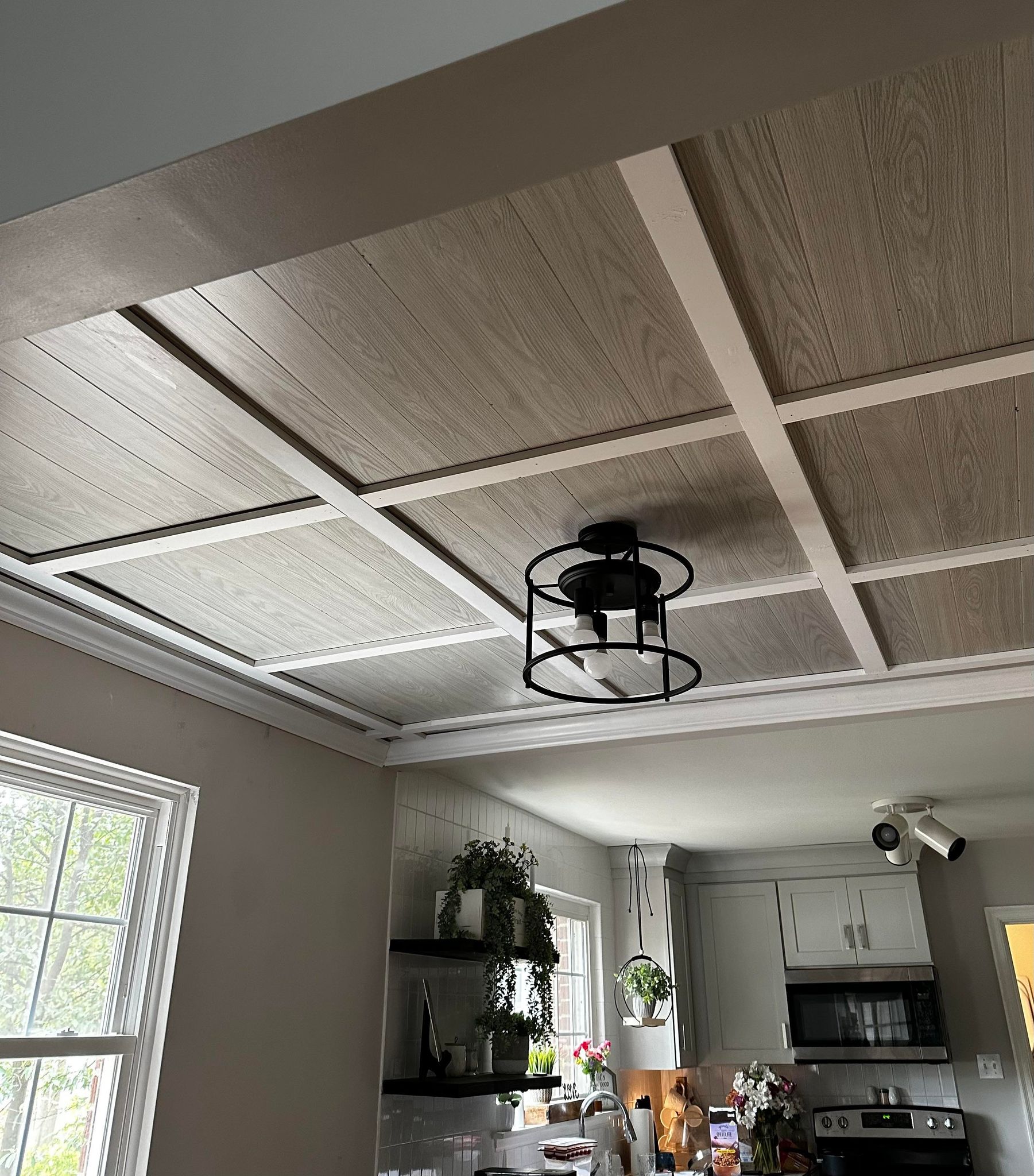 But guess what, there was one more ceiling that had the old pressboard and plaster (from the 1950s) on it and it began cracking so badly, we knew it was a hazard waiting to happen. So, we moved the furniture out, hung up plastic and started to take down that ceiling too. When the big pieces fell, it shook the whole house and tore a huge gash in our plastic ‘walls.’ Underneath the old plaster, we found all sorts of construction ‘surprises,’ including ceiling joists that were 2″ different in places. We had to add a bunch more 2x4s to make the ceiling foundation level. Then, I put my creativity to work to design a beautiful focal point for this dining room which is the center of the open concept living area. Neither of us had ever done a ceiling like this before, but we put in long hours and made it happen! After days of clinging to the ladder with my legs, while supporting paneling or wood with one hand and nailing with the heavy nailer with the other hand – every muscle ached! But, I’m pretty pleased with how it turned out and Daryl is unexpectedly impressed too. Finally, we could get back to painting, decorating and turning this place into a haven for our guests. It’s almost ready – you can check out the full listing here: https://www.furnishedfinder.com/property/512476_1 . It’s also available on AirBnb!